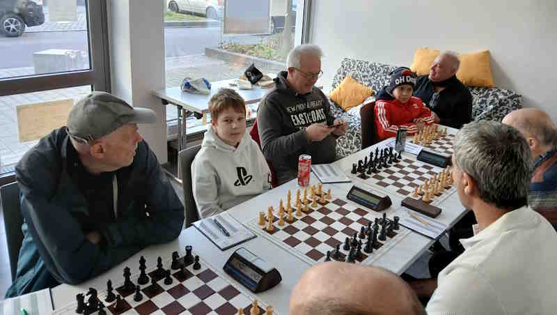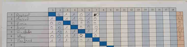 Auch wenn wir nette Witze und Gespräche hatten, kam an diesem Abend der Schachspaß keinesfalls zu kurz. Denn es wurde ein vereinsinternes Blitzturnier im Modus 5 Minuten und 3 Sekunden Zuschlag pro Zug je Spieler und Partie ausgerichtet. Jeder gegen jeden. Jede Partie wurde bis zum Schluss ausgekämpft und es blieb bis zum Schluss spannend. Am Ende stand Friedhelm ungeschlagen als Sieger fest. Gratulation! Er hatte alle Partien gewonnen außer die Partie gegen Marcel. Marcel gelang es, ihm ein Remis abzuknöpfen. Zweiter wurde überraschend unser Jugendleiter Manni. Bis auf die Niederlage gegen Friedhelm hat er alle Partien für sich entscheiden können. Eine ganz starke Leistung! Komplettiert wurde das Podium durch Marcel, der bis auf die Niederlage gegen Manni und das Remis gegen Friedhelm alle Begegnungen gewonnen hat.