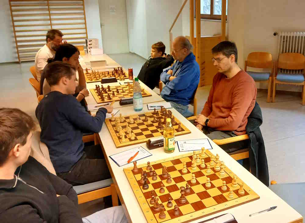 Heute durften wir die Schachfreunde aus Steißlingen in unseren neuen geräumigen und toll eingerichteten Räumlichkeiten begrüßen. Da die Steißlinger gut aufgestellt waren, zeichnete sich ein spannender Mannschaftskampf ab. Friedhelm an Brett 2 hatte im Mittelspiel leider einen Bauern stehen lassen. Nachdem er im Endspiel in schlechterer Stellung einen weiteren Bauern verloren hatte, musste er sich ein wenig später seinem starken Kontrahenten geschlagen geben. So ging der erste Punkt an Steißlingen. Ein wenig später konnten wir jedoch ausgleichen, nachdem Sadik seine Partie an Brett 7 mit den schwarzen Steinen gewonnen hatte. Nachdem sein Gegner einen Turm stehen gelassen hatte, konnte Sadik wenige Züge später mit einem schönen Finish die Partie für sich entscheiden. Eine kurze Zeit später holte Benjamin mit seinem Sieg am 6. Brett den 2. Punkt für uns. In einer ambitioniert angelegten Partie hatte er bereits im Mittelspiel einen Springer mehr und entschied die Partie in der Folge schnell für sich. Den nächsten Punkt holte für uns Andreas an Brett 3 souverän nach einer Unachtsamkeit seines Gegners. Mittlerweile stand es bereits 3:1 für uns. Lesya an Brett 8 kam gut aus der Eröffnung und hätte bereits im frühen Mittelspiel eine Figur in besserer Stellung gewinnen können. Doch sie agierte zu zaghaft, sodass es ihrer Gegnerin gelang, doch noch ins Spiel zu gelangen und die Partie für sich zu entscheiden. Arejou an Brett 3 spielte auf Angriff und stellte seinen Gegner vor große Herausforderungen. Sein Gegner verteidigte sich jedoch zäh. Nachdem Arejou in der Zeitnotphase ein grober Fehler unterlief, musste er die Partie leider aufgeben. Nun stand es 3:3. Jetzt lag es noch an Jonas und Marcel den Mannschaftssieg zu sichern. Jonas an Brett 1 kam mit Schwarz gut aus der Eröffnung und in der Folge in ein aussichtsreiches Endspiel. Dieses verwertete er sehr souverän gegen seinen starken Kontrahenten. Es stand 4:3. Marcel an Brett 5 beschloss im Mittelspiel einen Bauern am Königsflügel zu opfern, um die Stellung zu öffnen und gutes Spiel zu erlangen. Dieses Manöver zahlte sich aus, da Marcel in der Folge einen Bauern gewann. Diesen Mehrbauern konnte er bis zum Endspiel halten und die Partie souverän zum Sieg führen. Somit gewann die Mannschaft insgesamt mit 5:3. Gratulation zu dieser Mannschaftsleistung!