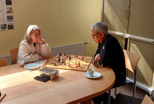 Im Duell der Ältesten verschaffte sich Klaus einen leichten Vorteil aus der Eröffnung heraus, den er ziemlich bald in einen zwei Bauern Vorsprung verwandelte. Manfred kämpfte noch eine Zeit lang mit der schlechteren Stellung, musste sich aber letztendlich geschlagen geben.