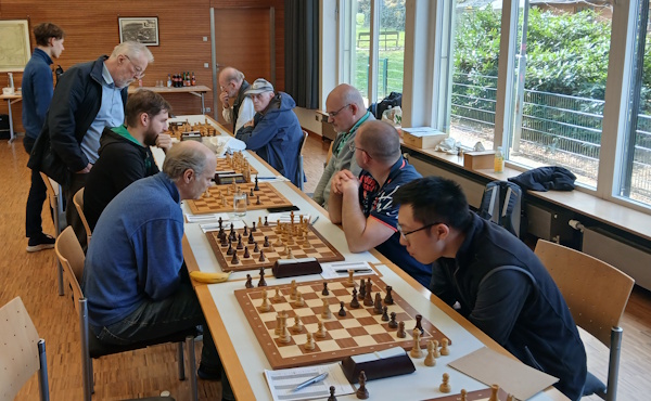 Die Schachfreunde aus Gaienhofen empfingen uns in netter Atmosphäre im Schloss Gaienhofen mit Seeblick. Es zeichnete sich gleich zu Beginn ein spannender Mannschaftskampf ab. Den ersten Punkt für uns holte Kai am 3. Brett in einer scharf angelegten Partie sehr souverän bereits nach 23 Zügen in nicht mal 90 Minuten. Anschließend trugen Andreas an Brett 2 und Frank an Brett 6 jeweils einen halben Punkt zum Mannschaftsergebnis bei. Es stand 2 : 1 für uns. Klaus an Brett 7 hatte bereits eine Qualität und einen Bauern gewonnen und konnte die Partie letztendlich siegreich zu Ende führen. Rainer am 8. Brett spielte das richtige Turmopfer. Er fand im Anschluss jedoch leider nicht die richtige Fortsetzung, sodass er die Partie wenige Züge später aufgeben musste. Es stand 3 : 2 für uns. Christoph an Brett 5 nahm trotz Mehrbauern im Läuferendspiel das Remisangebot an, da er den Gewinnweg nicht fand. Jonas an Brett 1 nahm in besserer Stellung das Remisangebot an, da er nur noch sehr wenig Bedenkzeit zur Verfügung hatte. Jetzt stand es bereits 4 zu 3 für uns. Nun lag es an Marcel an Brett 4, den Siegpunkt zu holen. Das tat er souverän im Bauernendspiel. Mit den heutigen Sieg haben wir unseren 4. Platz in der Tabelle verteidigt. Das entsprach zwar nicht ganz unserem Mindestziel, den 3. Platz zu holen. Mit dem Aufstieg von Engen und Konstanz in dieser Saison sind wir aber guter Dinge, dass wir kommende Saison um den Aufstieg spielen können.